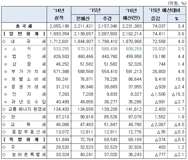 (조세금융신문=김태효 기자) 정부가 지난 8일 발표한 2016년 예산안을 보면 내년 국세 세입은 223조1천억원으로 지난 7월 추가경정예산을 편성하면서 수정한 올해 국세 세입보다 7조4천억원(3.4%) 늘어난다.