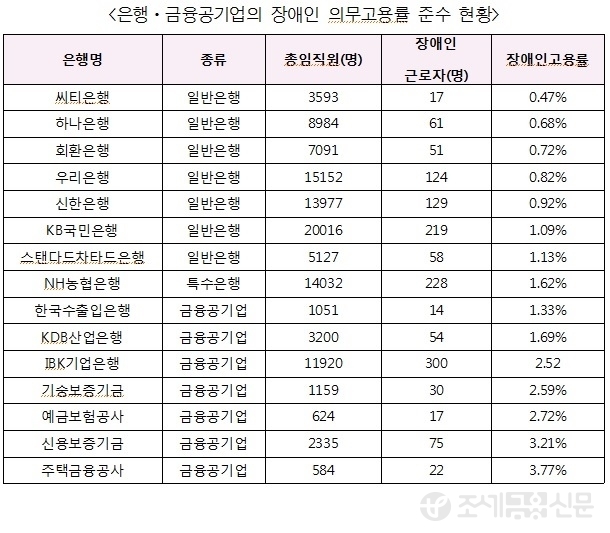 (조세금융신문=김사선 기자) 대부분의 은행ㆍ금융공기업이 장애인 의무고용률을 지키지 않고 있는 것으로 드러났다.