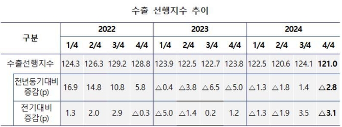 수출입은행에 따르면 4분기 수출선행지수는 121.0으로, 지난 3분기보다 3.1포인트(p), 지난해 4분기보다 2.8p 각각 하락한 것으로 집계됐다.