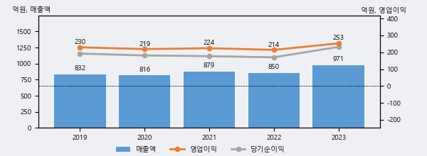 최근 실적을 살펴보면 2023년 매출액이 최근 5년 중 가장 높은 실적을 기록했음을 알 수 있다. 이전 최고 실적이었던 2021년 보다도 10.4%(91억 7천만원) 늘어난 것으로 나타났다.