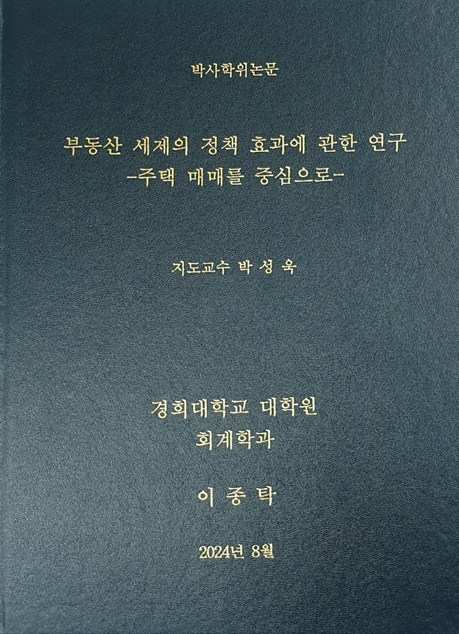 (조세금융신문=김영기 기자) 국세청 출신 이종탁 세무사(국세동우회 부회장, 서울지방세무사회장)가 경희대학교 대학원 박사학위 논문(2024년 8월)‘인 '부동산 세제의 정책효과에 관한 연구’(주택 매매를 중심으로)를 통해 정책제언을 해 주목을 받고 있다.