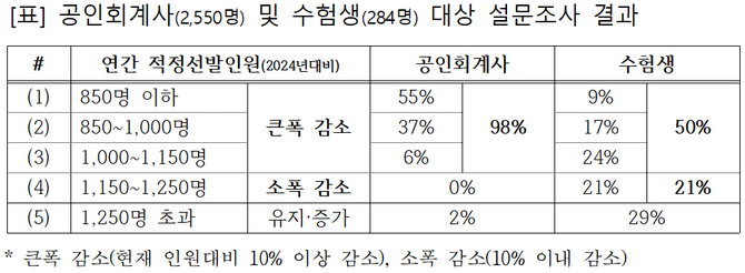 응답자 가운데 현직 회계사 98%, 수험생 50%는 향후 5년간 연간 선발인원이 2024년 선발인원(1250명)보다 큰 폭으로 줄어야 한다고 응답했다.