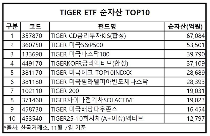 TIGER ETF 197종의 순자산 합계는 전날 기준 60조731억원으로, 지난 3월 50조원을 돌파한 지 8개월 만이다.
