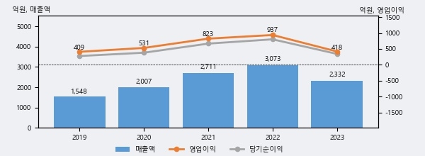 하나머티리얼즈의 2023년 매출액은 2332억으로 전년대비 -24.1% 하락했고, 영업이익 역시 418억으로 전년대비 -55.4% 하락했다. 이 회사의 매출액 증감률과 영업이익 증감률은 각각 코스닥 하위 1%, 하위 1%에 해당된다.