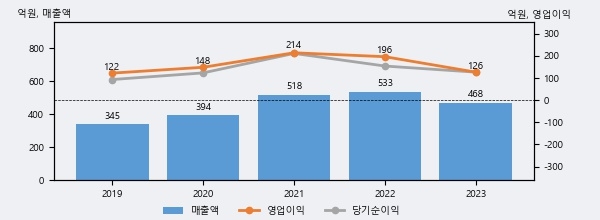 인크로스의 2023년 매출액은 468억으로 전년대비 -12.2% 하락했고, 영업이익 역시 126억으로 전년대비 -35.6% 하락했다. 이 회사의 매출액 증감률과 영업이익 증감률은 각각 코스닥 하위 31%, 하위 40%에 해당된다.