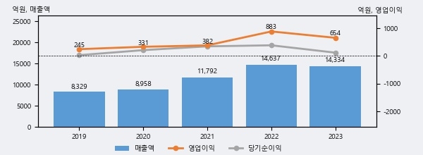 대동의 2023년 매출액은 전년대비 -2.1% 줄어든 1조 4334억원이고, 영업이익 역시 전년대비 -25.9% 줄어든 654억원을 기록했다. 이 회사의 매출액 증감률과 영업이익 증감률은 각각 코스피 하위 44%, 하위 36%에 해당된다.