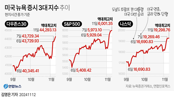 지난주 트럼프 재집권 확정 이후 강세 랠리를 이어가며 올해 들어 최고의 한 주를 보낸 뉴욕증시는 고점을 더 끌어 올리면서 분위기를 이어갔다.