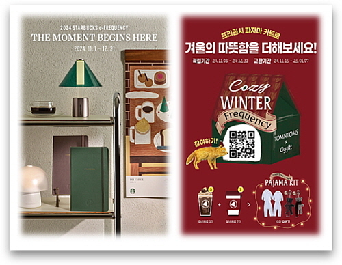 양 브랜드중 가장 먼저 프로모션 소식을 알린 곳은 스타벅스다, 지난 1일부터 12월 31일까지 특별한 매일의 순간을 함께 할 ‘2024 겨울 e-프리퀀시’ 이벤트를 진행한다고 밝힌 것인데,