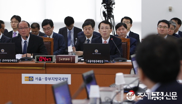 (조세금융신문=전한성 기자) 서울지방국세청과 중부지방국세청에 대한 국회 기획재정위원회의 국정감사가 11일 오전 서울 종로구 수송동 서울지방국세청에서 열린 가운데 김연근(오른쪽) 서울청장과 김재웅 중부청장이 나란히 앉아 새누리당 심재철 의원의 질의를 듣고 있다.