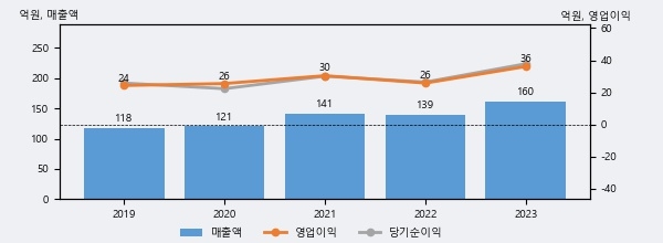 최근 실적을 살펴보면 2023년 매출액이 최근 5년 중 가장 높은 실적을 기록했음을 알 수 있다. 이전 최고 실적이었던 2021년 보다도 13.9%(19억 6천만원) 늘어난 것으로 나타났다.