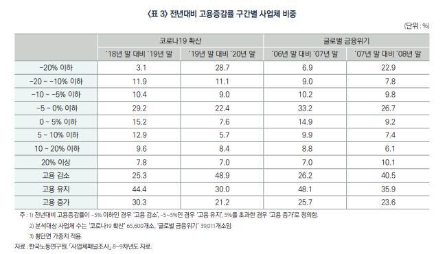 글로벌 금융위기 때는 고용이 40.5% 감소했는데, 코로나19 때가 고용 감소 폭이 8.4%포인트 컸던 셈인데, 특히 '-20% 이하'로 고용이 크게 감소한 사업체의 비중은 코로나19 발생 후 28.7%로, 글로벌 금융위기 후의 22.9%에 비해 5.8%포인트 높았다.