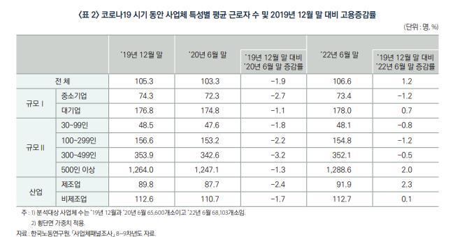 당시 모든 규모의 사업체에서 고용이 줄었으나, 대기업과 500인 이상 사업체는 다른 규모와 비교해 고용 감소 정도가 작았다. 고용은 코로나19 발생 2년 6개월 후 다시 1.2% 증가해 코로나19 발생 직전 수준을 상회했으나, 고용률 증감은 사업체 규모에 따라 갈렸다.