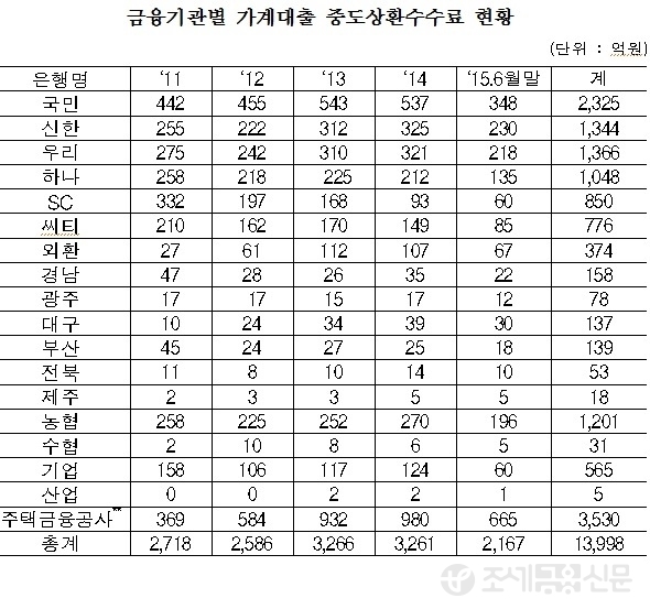 정부가 실태파악조차 못하고 있는 동안, 은행권(주택금융공사 포함)에서 가계대출 중도상환수수료로 11년부터 4년반동안 벌어들인 수익이 1조3,998억원에 달하고 있다.