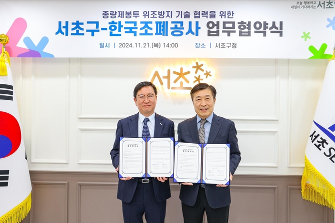 협약식에는 전성수 서초구청장과 성창훈 한국조폐공사 사장 등 관계자들이 참석했다.