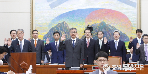 (조세금융신문=전한성 기자) 금융위원회에 대한 국회 정무위원회의 국정감사가 14일 서울 여의도 국회에서 열린 가운데 임종룡 금융위원장과 금융위 관계자들이 증인선서를 하고 있다.