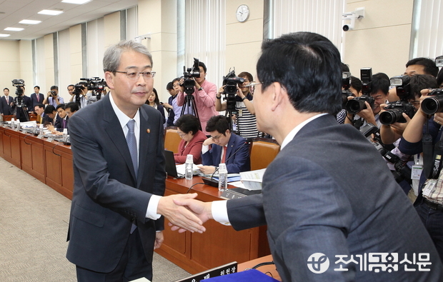 (조세금융신문=전한성 기자) 금융위원회에 대한 국회 정무위원회의 국정감사가 14일 서울 여의도 국회에서 열린 가운데 임종룡 금융위원장이 정우택 정무위원장과 악수 나누고 있다.
