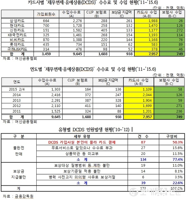 카드사들은 회원들에게 DCDS 수수료(매달 카드결제액의 약 0.35~0.49%)를 받아 각 보험사에 보험료를 지불하여 지출리스크를 회피하고 수익을 올리는 것이다. 수수료에는 약간의 콜센터 운영비와 모집비가 일부 포함된 것으로 알려졌다.