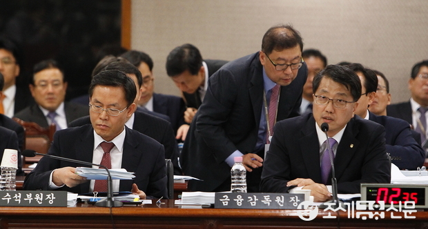 (조세금융신문=전한성 기자) 금융감독원에 대한 국회 정무위원회의 국정감사가 15일 오전 서울 여의도 금융감독원에서 열린 가운데 진웅섭(오른쪽) 원장과 서태종 수석부원장이 나란히 앉아 있다.
