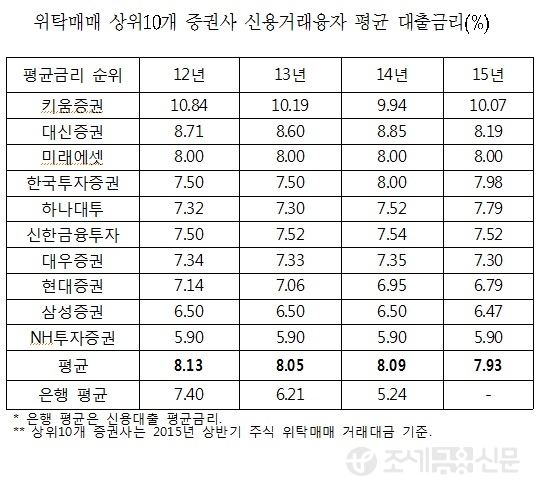 국회 정무위 소속 새정치민주연합 김기준 국회의원(양천갑 지역위원장)이 금융감독원으로부터 제출 받은 ‘최근 5년간 신용거래 및 예탁증권담보대출 현황’ 자료에 따르면, 위탁매매 상위10개 증권사의 신용거래융자 평균 대출금리(신규취급액 기준)는 같은 기간 8.13%에서 7.93%로 불과 0.2%p 내리는데 그쳤다.