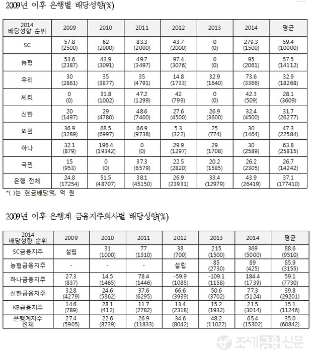 2010년 하나은행이 모기업인 하나금융지주의 외환은행 인수자금 마련을 위해 당기순이익(9851억원)의 두 배(196.3%)에 가까운 1조9342억원을 배당한 것을 감안하면, 작년 배당성향은 역대 최고라고 할 수 있다.
