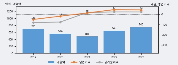 최근 실적을 살펴보면 2023년 매출액이 최근 5년 중 가장 높은 실적을 기록했음을 알 수 있다. 이전 최고 실적이었던 2019년 보다도 6.3%(44억 4천만원) 늘어난 것으로 나타났다.
