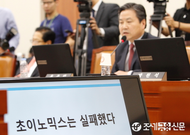 (조세금융신문=전한성 사진기자) 기획재정부에 대한 국회 기획재정위원회의 국정감사가 15일 서울 여의도 국회에서 열린 가운데 새정치민주연합 홍종학 의원이 3년동안 최경환 경제부총리의 경제정책 실패를 정리한 PPT자료를 보이며 질의하고 있다.