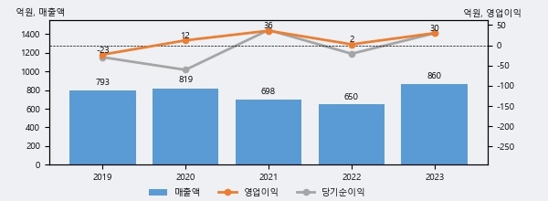 최근 실적을 살펴보면 2023년 매출액이 최근 5년 중 가장 높은 실적을 기록했음을 알 수 있다. 이전 최고 실적이었던 2020년 보다도 5.1%(41억 6천만원) 늘어난 것으로 나타났다.