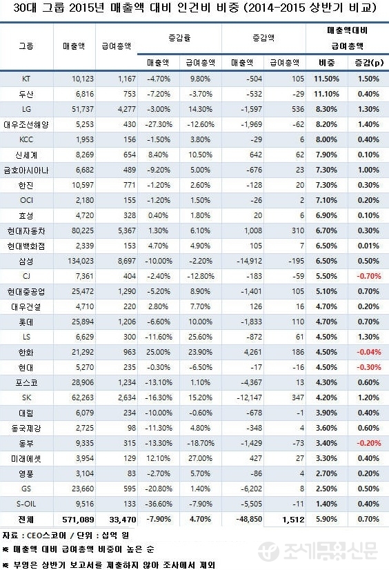 이어 LG(8.3%), 대우조선해양(8.2%), KCC(8.0%) 그룹의 인건비 비중이 8%를 넘었고, 신세계(7.9%), 한진·금호아시아나(7.3%), OCI(7.1%), 효성(6.9%), 현대자동차(6.7%), 현대백화점·삼성(6.5%) 등이 30대 그룹 평균치인 5.9%를 웃돌았다.