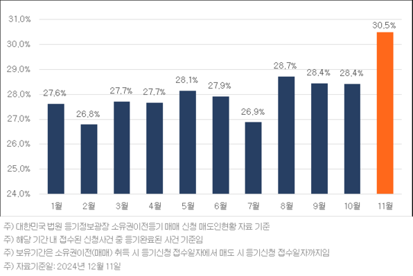 서울 장기 보유 매도자 비중은 올해 월간 27%~28% 비중을 차지하며 큰 등락 없는 모습을 보여왔다. 하지만 스트레스 총부채원리금상환비율(DSR) 2단계가 지난 9월부터 시행됐고 가계대출 강화에 대출규제 등이 전방위적으로 진행되면서 매수인의 관망세가 짙어졌다.
