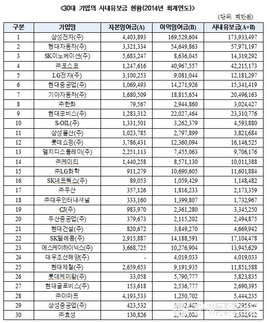 이익잉여금과 자본잉여금을 합계한 사내유보금은 총 502조 8천여억원이었으며, 30개사 평균은 약 16조 7천여억원이었다.
