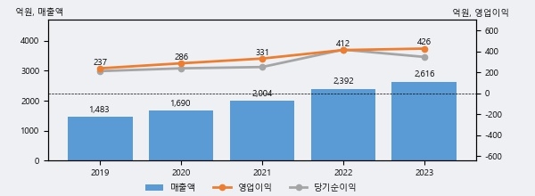 최근 3년간의 실적을 살펴보면 안정적 성장세를 보이고 있다. 최근 3년간 매출로 볼 때 매년 꾸준히 증가하고 있다. 다만 최근에 그 증가폭이 다소 감소하고 있다.