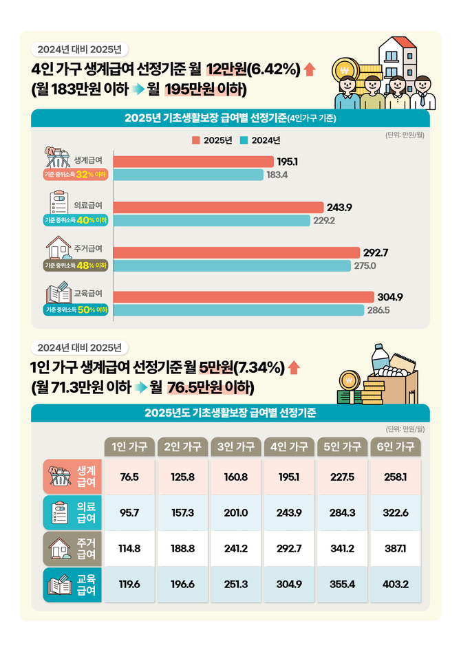 생계급여는 선정기준이 곧 최저보장 수준으로 4인 가구 기준 ‘2024년 183만 3572원에서 2025년 195만 1287원으로 인상했다.