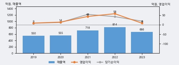 에이치케이는 2023년 매출액 666억원과 영업이익 8억원을 기록했다. 전년대비 매출은 -18.1%, 영업이익은 -85.5% 각각 하락했다. 이 회사의 매출액 증감률과 영업이익 증감률은 각각 코스닥 하위 23%, 하위 23%에 해당된다.
