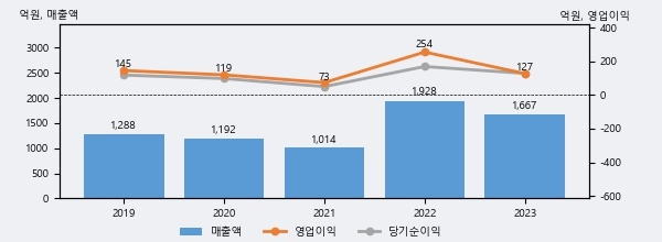 씨앤지하이테크의 2023년 매출액은 1667억으로 전년대비 -13.5% 하락했고, 영업이익 역시 127억으로 전년대비 -50.2% 하락했다. 이 회사의 매출액 증감률과 영업이익 증감률은 각각 코스닥 하위 29%, 하위 35%에 해당된다.