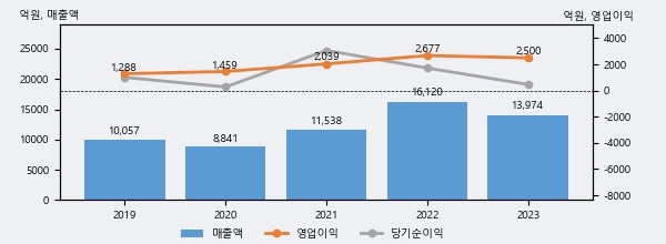 대한해운의 2023년 매출액은 1조 3974억으로 전년대비 -13.3% 하락했고, 영업이익 역시 2500억으로 전년대비 -6.6% 하락했다. 이 회사의 매출액 증감률과 영업이익 증감률은 각각 코스피 하위 21%, 하위 46%에 해당된다.