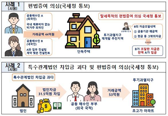 한 예로 국내 체류비자가 없는 비거주 외국인 A씨와 A씨의 내국인 컨설턴트 B씨는 투기과열지구 내 재정비촉진지구 단독주택을 44억원에 매수했다. B씨는금융기관 예금액 4억원과 현금 4억3000만원으로 자금 일부를 조달했다고 소명했으나 A씨가 B씨의 현금을 입금하는 등 탈세목적의 편법증여가 의심됐다.