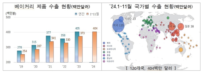 관세청은 24일 '2024년 1월~11월까지 베이커리 제품의 수출 실적'을 발표하고, 올해 들어 베이커리 제품 수출액이 전년동기대비 8.3% 증가한 4억 400만 달러로 동기간 역대 최대 실적을 기록했다고 밝혔다.