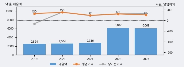HDC랩스의 2023년 매출액은 전년대비 -0.7% 줄어든 6063억원이고, 영업이익 역시 전년대비 -14.6% 줄어든 105억원을 기록했다. 이 회사의 매출액 증감률과 영업이익 증감률은 각각 코스피 하위 48%, 하위 41%에 해당된다.