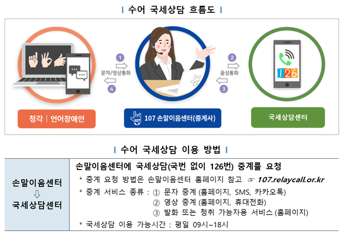 국세청(청장 강민수)은 25일 손말이음센터에 접속, 국세상담 서비스(번호없이126번) 이용을 요청할 경우 실시간 수어통역으로 세법상담을 제공한다고 밝혔다.