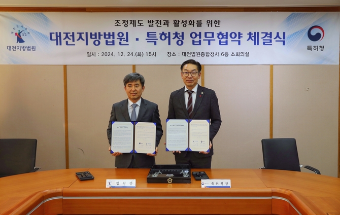 특허청과 대전지방법원은 24일 대전지법 회의실에서 '법원-조정 연계제도 시행을 위한 업무협약'을 체결했다.