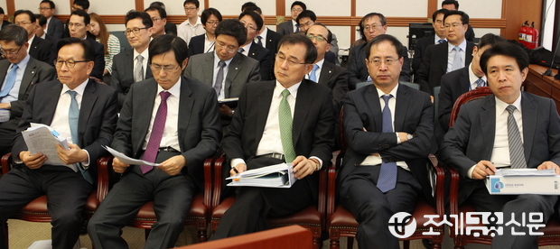(조세금융신문=전한성 기자) 한국은행에 대한 국회 기획재정위원회의 국정감사가 17일 서울 남대문로 한국은행에서 열린 가운데 금융통화위원회 위원들이 나란히 앉아 있다.