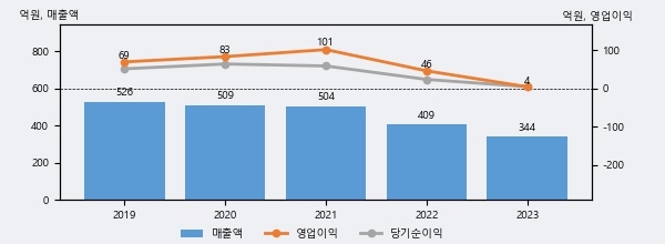최근 3년간의 실적을 살펴보면, 매출액은 3년 연속 하락하고 있으나 그 하락폭은 줄어들고 있음을 알 수 있다.