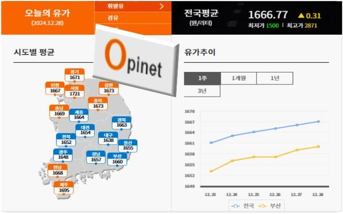 28일 한국석유공사 유가정보시스템 오피넷에 따르면 12월 넷째 주(22∼26일) 전국 주유소 휘발유 평균 판매가는 직전 주 대비 L당 9원 상승한 1천662.2원을 기록했다.