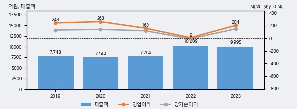 대성에너지의 2023년 매출액은 9995억으로 전년대비 -2.1% 하락했고, 영업이익은 204억으로 전년대비 2,069.1% 상승했다. 이 회사의 매출액 증감률과 영업이익 증감률은 각각 코스피 하위 44%, 상위 1%에 해당된다.