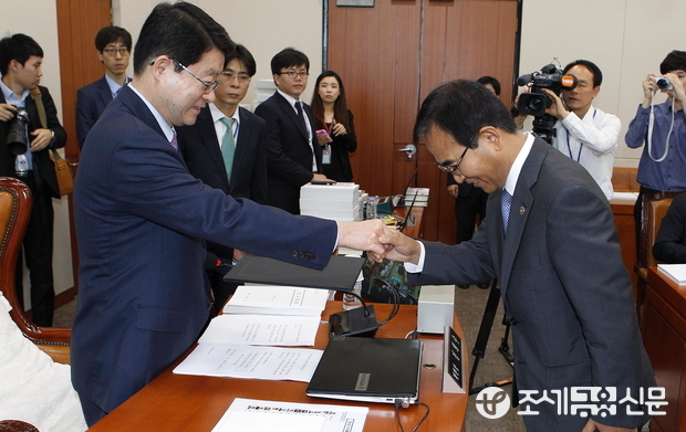 (조세금융신문=전한성 기자) 관세청, 조달청, 통계청 등에 대한 국회 기획재정위원회의 국정감사가 18일 서울 여의도 국회에서 열린 가운데 김낙회(오른쪽) 관세청장이 정희수 위원장과 악수 나누고 있다.