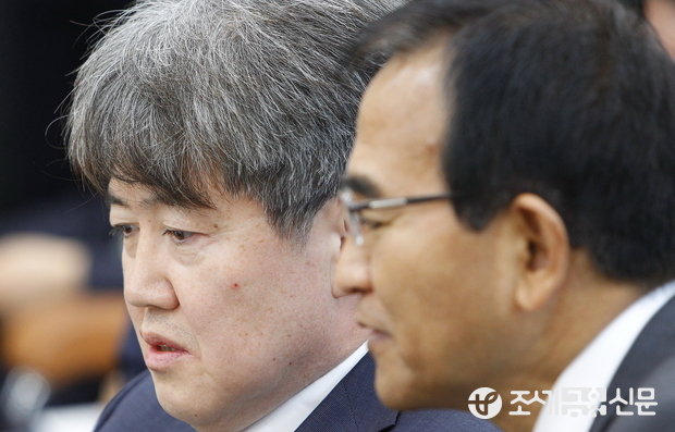 (조세금융신문=전한성 기자) 관세청, 조달청, 통계청 등에 대한 국회 기획재정위원회의 국정감사가 18일 서울 여의도 국회에서 열린 가운데 유경준(왼쪽) 통계청장이 김낙회 관세청장과 귀엣말을 나누고 있다.