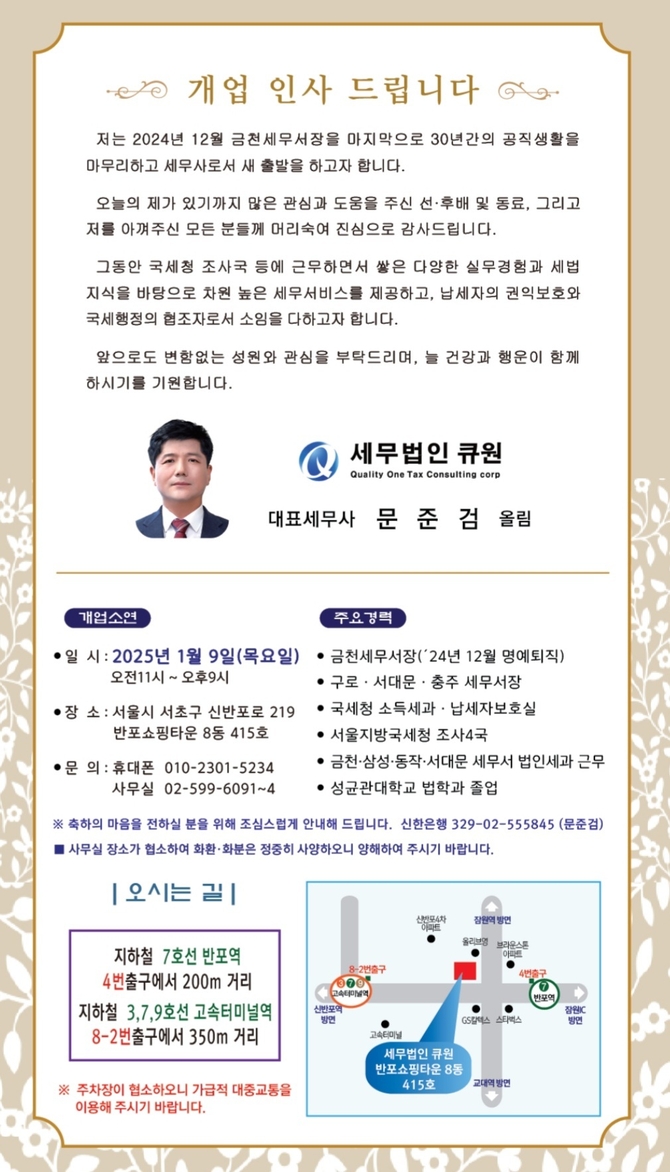 (조세금융신문=김영기 기자) 제33대 문준검 금천세무서장이 지난 연말 명예퇴임(부이사관)하고, ‘세무법인 큐원’ 대표세무사로 새 출발을 한다. 개업소연은 오는 9일 서울 서초구 신반포로 219 반포쇼핑타운 8동 415호에서 지인들을 모시고 갖는다.