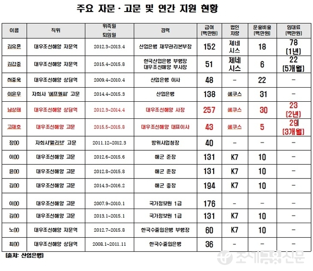(조세금융신문=김사선 기자) 민병두 의원(새정치민주연합⋅정무위원회)이 산업은행으로부터 제출받은 ‘대우조선해양 자문⋅고문 현황’을 분석한 결과, 2004년부터 특별한 자문 실적도 없이 억대의 연봉과 고급 차량 및 운용비, 고액 사무실 임대료, 자녀학자금, 의료비, 보험료 등을 지원받은 자문역이 60명으로 드러났다.