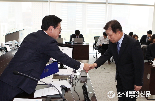 (조세금융신문=전한성 기자) 산업은행·기업은행·예금보험공사에 대한 국회 정무위원회의 국정감사가 21일 서울 여의도 산업은행 본점에서 열린 가운데 증인으로 출석한 고재호(오른쪽) 전 대우조선해양 대표이사가 정우택 위원장과 악수 나누고 있다.