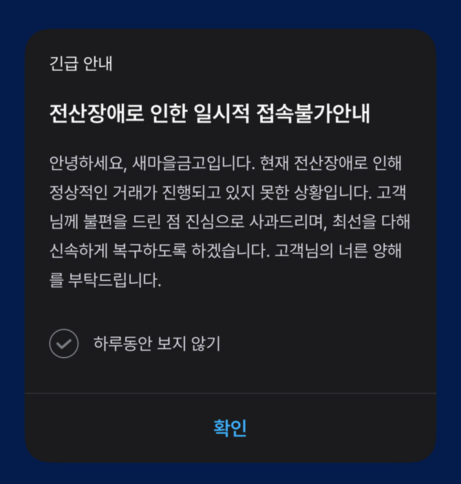 이날 새마을금고중앙회는 긴급 안내를 통해 ‘현재 전산 장애로 인해 정상적인 거래가 진행되고 있지 못한 상황이다. 고객님께 불편을 드린 점 진심으로 사과드린다’라고 전했다.